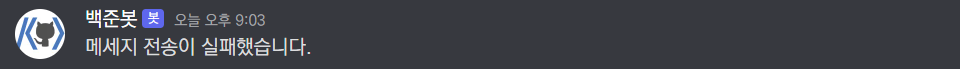 If sending the embed fails, or if the solved.ac server is unstable and data cannot be retrieved, it prints “메세지 전송이 실패했습니다.” (“Failed to send message.”).